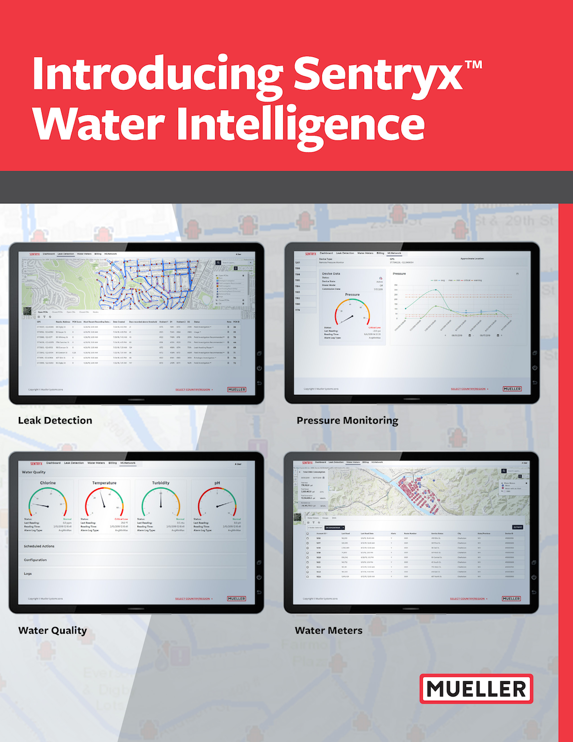 Sentryx obtains data from any access point along the pipe, including sensors, meters and valves, to display important information about pressure, flow, leakage, chlorine and pH. Mueller machine learning technology transforms data to provide utilities with insight into the health of their distribution system in order to make informed operational and maintenance decisions.